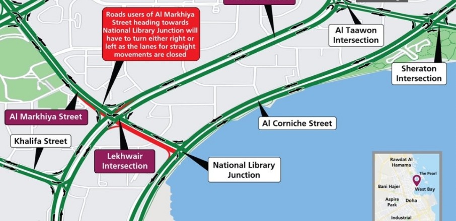 ഇൻഫ്രാസ്ട്രക്ചർ ജോലികൾ പൂർത്തിയാക്കുന്നതിനായി 2021 ഓഗസ്റ്റ് 20 വെള്ളിയാഴ്ച പുലർച്ചെ മുതൽ നാലു ദിവസത്തേക്ക് ലേഖ്വയർ ഇന്റർസെക്ഷനിൽ നിന്നും നാഷണൽ ലൈബ്രറി ഇന്റർസക്ഷനിലേക്കുള്ള ദിശയിലുള്ള അൽ മർഖിയ സ്ട്രീറ്റിന്റെ ഒരു ഭാഗം താൽക്കാലിക അടച്ചുപൂട്ടുമെന്ന് ഖത്തർ പൊതുമരാമത്ത് അതോറിറ്റിയായ അഷ്ഘൽ അറിയിച്ചു.