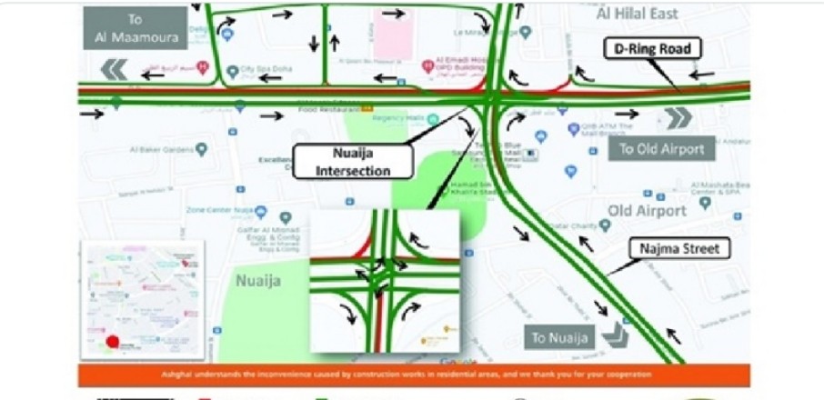 ഓൾഡ് എയർപോർട്ടിൽ നിന്ന് നോർത്ത് ഭാഗത്തേക്കുള്ള ഗതാഗതത്തിനായുള്ള സർവീസ് റോഡുകളുടെ ഭാഗങ്ങൾക്കൊപ്പം ഡി-റിംഗ് റോഡിലെ നുഐജ ഇന്റർസെക്ഷനിൽ വ്യാഴാഴ്ച രാത്രി മുതൽ ശനിയാഴ്ച രാവിലെ വരെ ഭാഗികമായി അടച്ചിടുമെന്ന് പൊതുമരാമത്ത് അതോറിറ്റി (അഷ്ഗാൽ) അറിയിച്ചു.