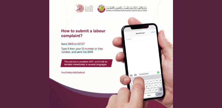 92727 എന്ന നമ്പറിലേക്കാണ് പരാതികൾ അയക്കേണ്ടത്. ആദ്യം 5 എന്ന് ടൈപ്പ് ചെയ്തതിനു ശേഷം ഖത്തർ ഐ.ഡി നമ്പറോ, വിസ നമ്പറോ രേഖപ്പെടുത്തി പരാതി അയക്കാവുന്നതാണ്. കൂടാതെ 24 മണിക്കൂറും, വ്യത്യസ്ത ഭാഷകളിലും ഈ സേവനം ലഭ്യമാണ്.