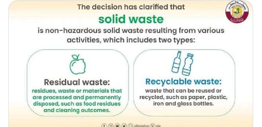 അത്തരം മാലിന്യങ്ങൾ രണ്ട് തരം കണ്ടെയ്നറുകളിലായാണ് സംസ്കരിക്കേണ്ടത്. പുനരുപയോഗിക്കാവുന്ന മാലിന്യങ്ങൾക്കായി നീല നിറമുള്ള പാത്രങ്ങളും അവശിഷ്ട മാലിന്യങ്ങൾക്ക് (ജൈവ) ചാരനിറത്തിലുള്ള പാത്രങ്ങളും ഉപയോഗിക്കണമെന്നു മുനിസിപ്പാലിറ്റി മന്ത്രാലയം അറിയിച്ചു. ഖരമാലിന്യത്തിന്റെ നിർവചനം “വിവിധ പ്രവർത്തനങ്ങളുടെ ഫലമായുണ്ടാകുന്ന അപകടകരമല്ലാത്ത ഖരമാലിന്യങ്ങൾ” എന്നാണ് തീരുമാനം വ്യക്തമാക്കുന്നത്. പേപ്പർ, പ്ലാസ്റ്റിക്, ഇരുമ്പ്, ഗ്ലാസ് പാത്രങ്ങൾ തുടങ്ങിയ പുനരുപയോഗം ചെയ്യാൻ കഴിയുന്ന മാലിന്യങ്ങൾ ഇതിൽ ഉൾപ്പെടുന്നുവെന്ന് ഖത്തർ ന്യൂസ് ഏജൻസി റിപ്പോർട്ട് ചെയ്തു.