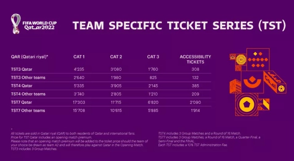 ഖത്തർ നിവാസികൾക്ക് (കാറ്റഗറി 4) ഗ്രൂപ്പ് മത്സരങ്ങൾക്ക് 40 റിയാൽ മുതൽ ഫൈനൽ മത്സരങ്ങൾക്ക് 750 റിയാൽ വരെ ഫിഫ ഒരു പ്രത്യേക വിലയും വാഗ്ദാനം ചെയ്യുന്നു.