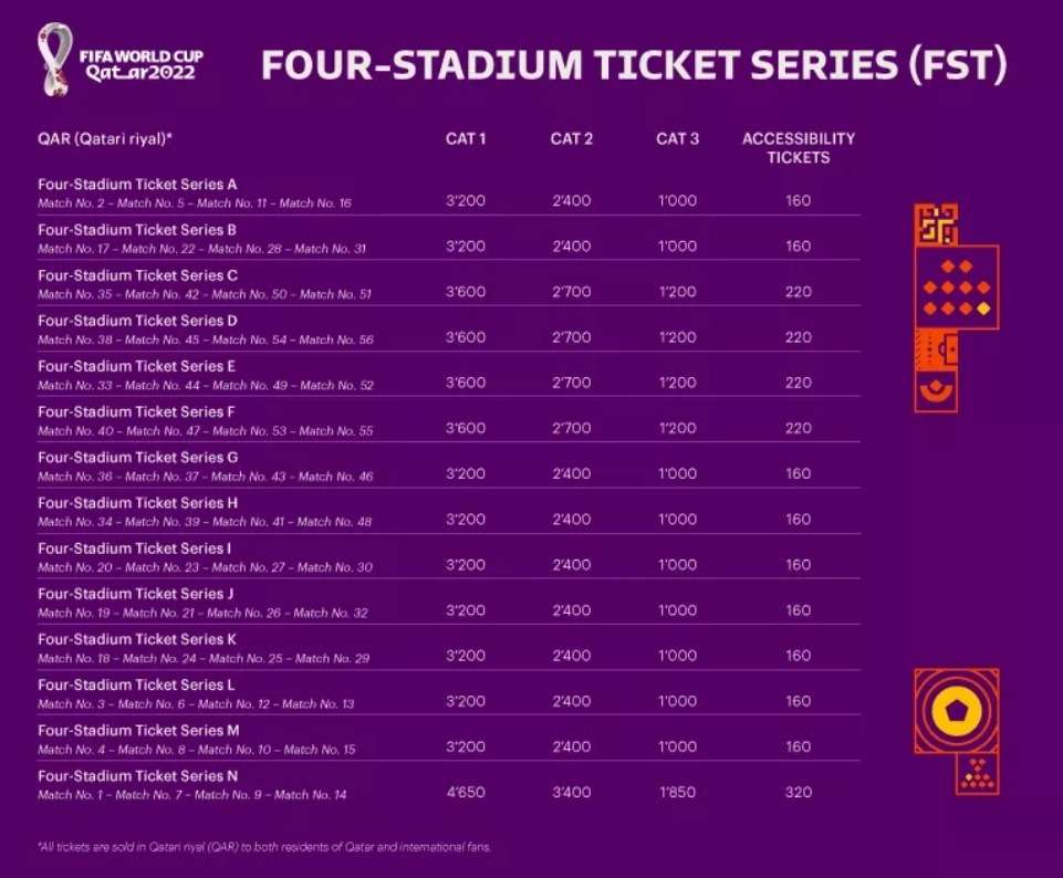 ടിക്കറ്റ് കാറ്റഗറി 4 ഖത്തർ നിവാസികൾക്കായി മാത്രം റിസർവ് ചെയ്തിരിക്കുന്നു (എല്ലാ ഓൺലൈൻ വിൽപ്പനയ്ക്കും, ഓർഡർ സമയത്ത്, ഓരോ ടിക്കറ്റ് അപേക്ഷകനും ഖത്തറിലെ അവരുടെ താമസസ്ഥലത്തിന്റെ വിലാസവും അവരുടെ ക്യുഐഡി നമ്പറും നൽകണം).