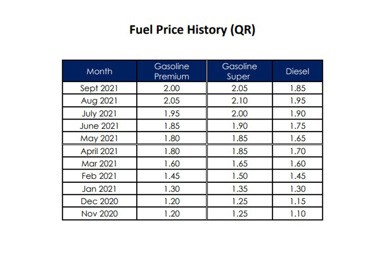 പ്രീമിയം ഗ്രേഡ് പെട്രോളിന് ഒക്ടോബറിൽ ലിറ്ററിന് 2 ഖത്തർ റിയാൽ വില വരും സെപ്റ്റംബറിലെ സൂപ്പർ ഗ്രേഡ് പെട്രോൾ വിലയായ ലിറ്ററിന് 2.05 റിയാൽ എന്നത് ഒക്ടോബറിലും നിലനിർത്തും.