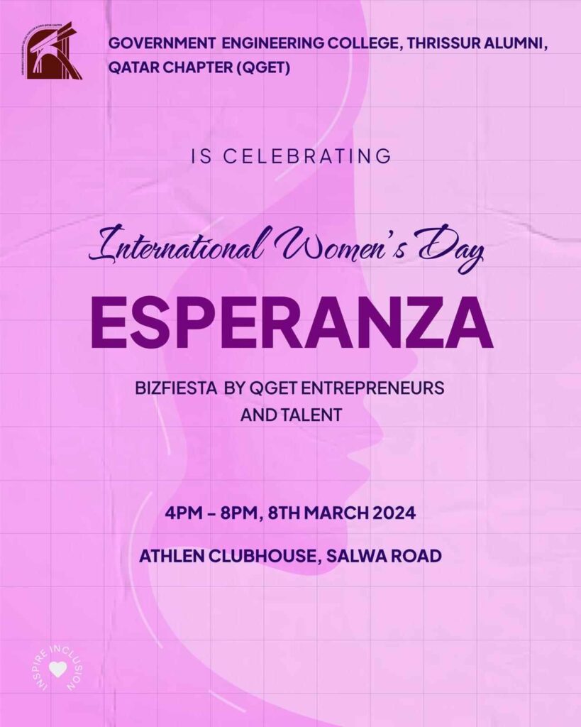 ദോഹ : ലോക വനിതാ ദിനത്തിൽ തൃശ്ശൂർ ഗവൺമെൻറ് എഞ്ചിനീയറിംഗ് കോളേജ് ഖത്തർ അലുമനൈ ചാപ്റ്റർ QGET സംഘടിപ്പിച്ച ESPERANZA കാണികളുടെ പങ്കാളിത്തം കൊണ്ടും പരിപാടിയുടെ വ്യത്യസ്തത കൊണ്ടും ശ്രദ്ധേയമായി.